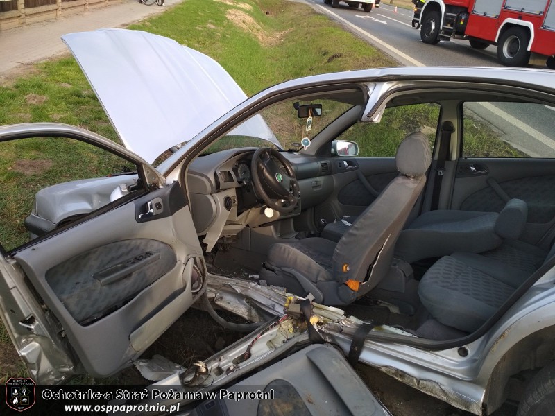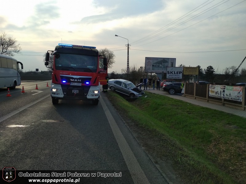 11.04.2018 tuz przed godziną 17 zostaliśmy zadysponowani do wypadku dwóch samochodów osobowych. W wypadku uczestniczyły cztery osoby, trzy zostały przetransportowane do szpitala. Jedna osoba pozostawała uwięziona w pojeździe. Przy pomocy narzędzi hydraulicznych została uwolniona i na noszach typu deska przekazana ZRM. Działania straży Pożarnej polegały również na zabezpieczeniu miejsca zdarzenia, kierowaniu ruchem oraz odłączeniu akumulatorów. SiŚ: OSP Paprotnia GCBA I GBARt, JRG Sochaczew GBA I SLRt, Dowódca JRG, ZRM x2, Policja x2